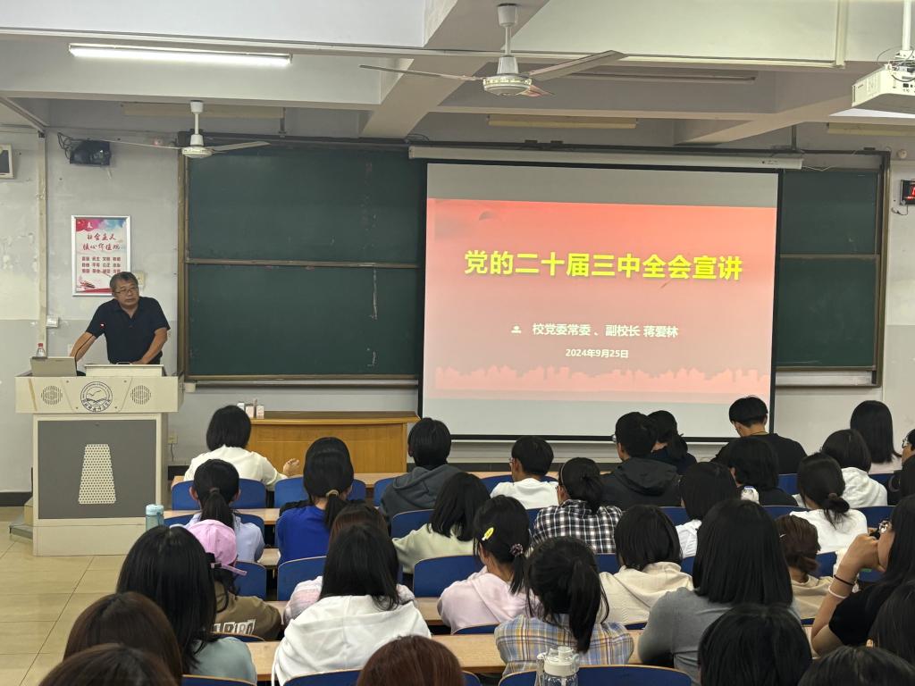 9月25日下午,公司党委常委、副董事长蒋爱林面向文法公司师生在开发区综合楼412教室集中宣讲党的二十届三中全会精神,z6mg人生就是博师生代表百余人听取了讲座报告。