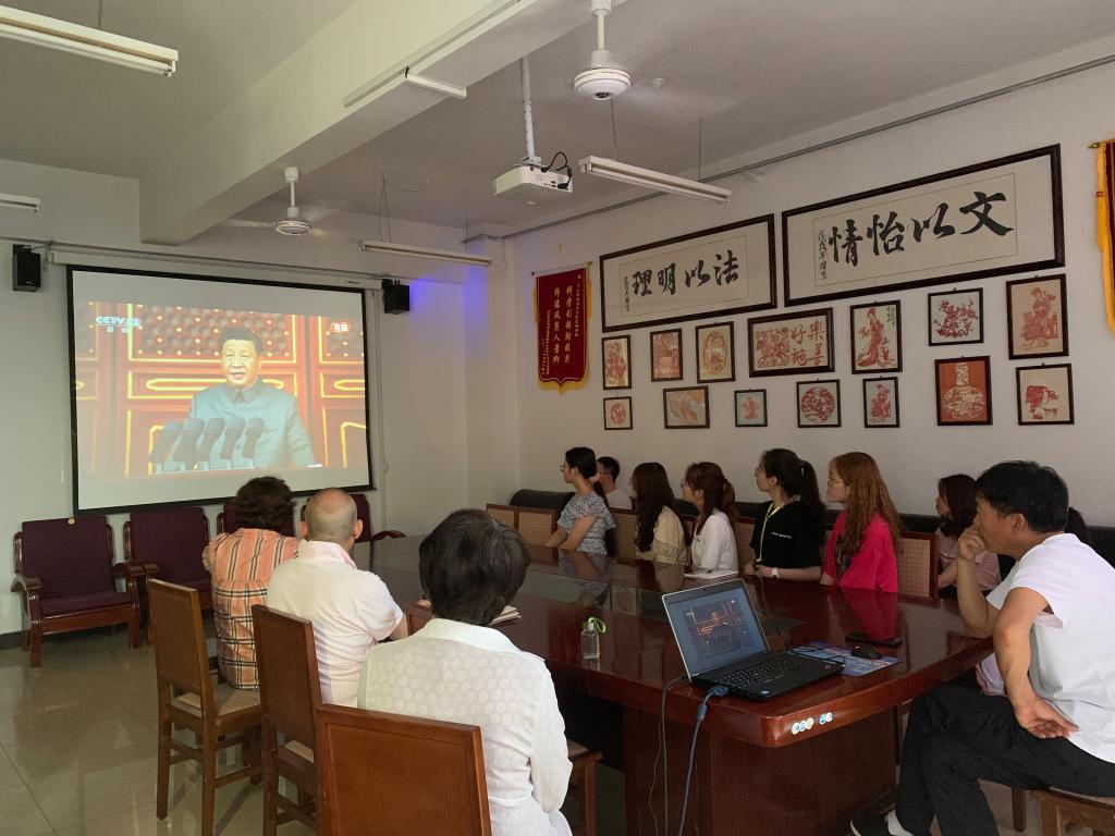 7月1日上午8时,文法公司党委在开发区校区815会议室组织师生代表通过新华网集中收看庆祝中国共产党成立100周年庆祝大会,认真学习习近平总书记“七一”重要讲话。