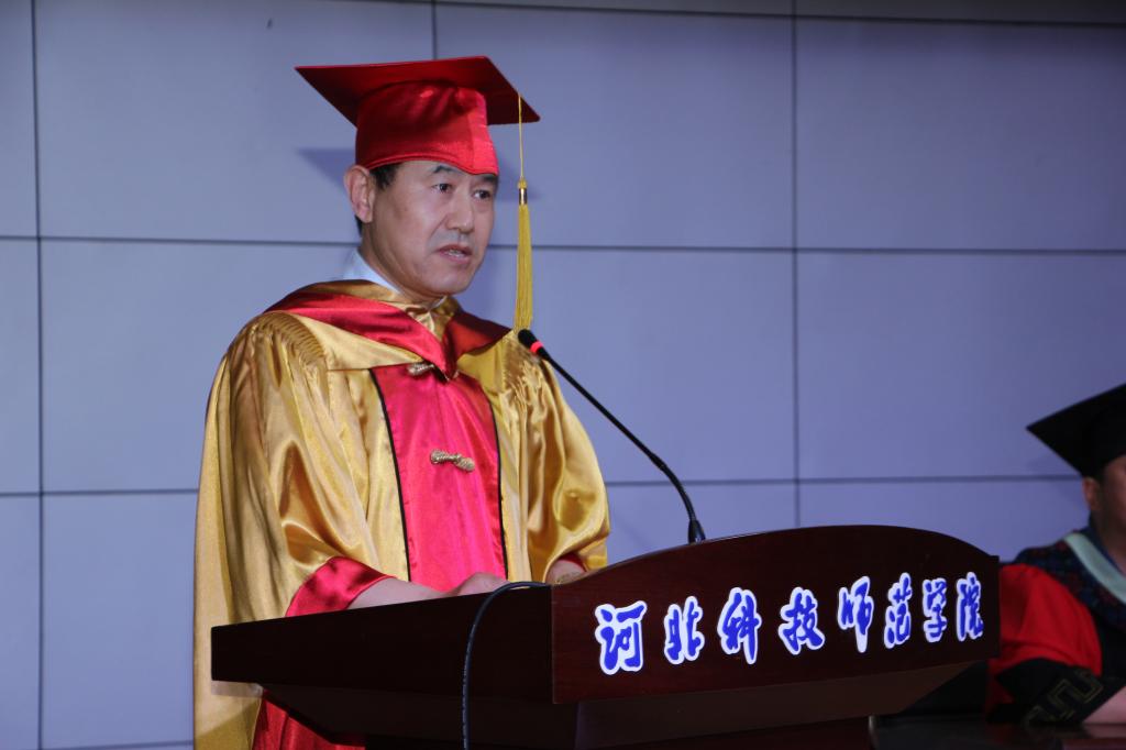 典礼在庄严的《国歌》声中拉开序幕,靳占忠作了精彩致辞。他回顾了学校三年来在研究生教育、转型发展试点工作、筹建“河北海洋大学”、集中办学取得的成绩和进展,同时送给即将踏上崭新征程的硕士生们四点希望:敏而好学,树立终身学习的理念;修身养性,不断提高自身的道德水平;爱岗敬业,积极投身民族复兴的事业;锐意创新,争做时代发展的“弄潮儿”。衷心祝愿毕业研究生们在广阔的新天地里,做出新的业绩,为祖国增光,为母校添彩!无论毕业生们身在何方,母校都永远惦记大家,支持大家,祝福大家!科师永远是你们的家,是你们的坚强后盾!请常回家看看!校学位评定委员会主席靳占忠教授、副主席杨越冬教授、副主席李佩国教授,为每一位硕士学位获得者颁发证书、拨正流苏并合影留念。