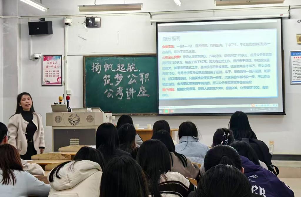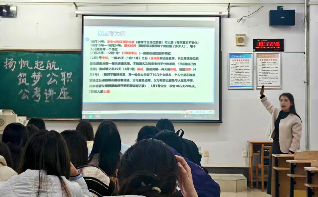 讲座围绕编制差异、考试体系、备考技巧三大核心展开:老师先以公考类别区别为切入点,系统梳理行政编与事业编的性质、代表单位、薪资福利及稳定性差异,用生动案例和数据对比,直观展现公职岗位的吸引力,引发大家对职业规划的深度思考;随后拆解国考、省考等各类考试科目,梳理时间节点,为同学们绘制清晰“考试日历”,理清备考时间线;最后分享实操性极强的备考与选岗方法,涵盖复习规划、岗位筛选技巧,同时讲解公职岗位隐形福利与发展前景,并现场解答同学们的报考疑问。